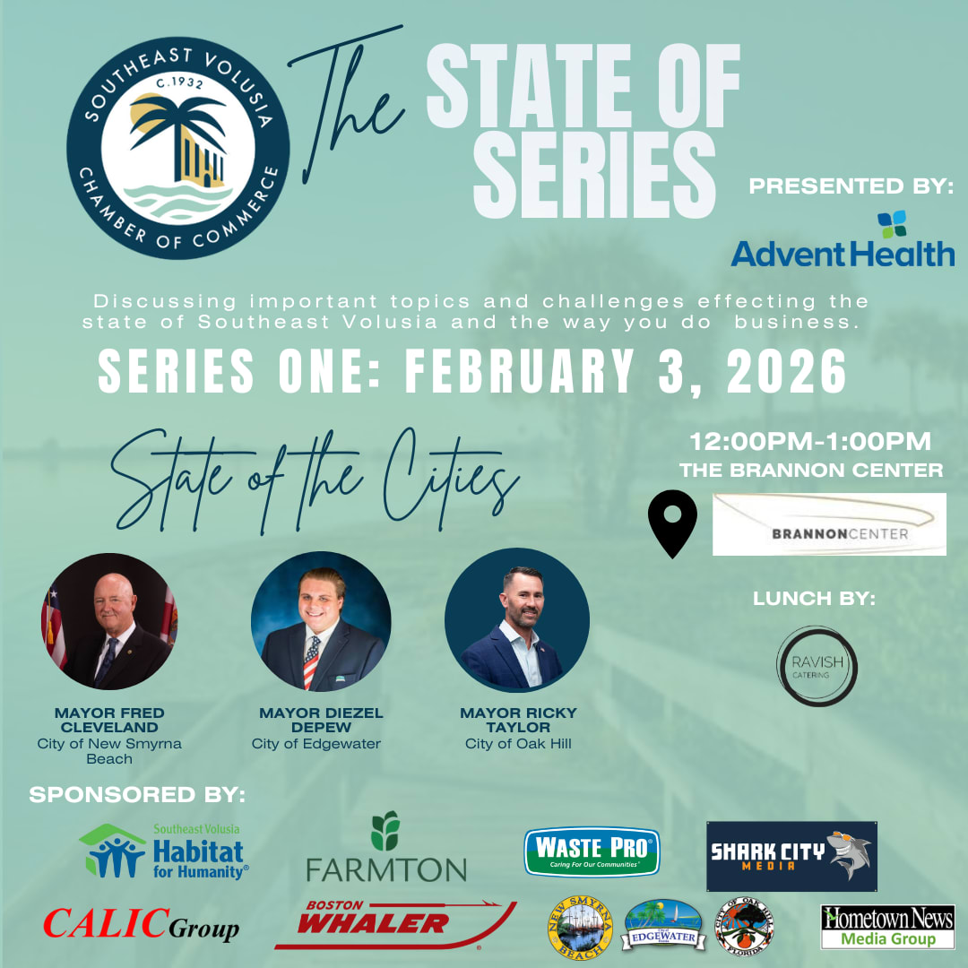 Join us for The State of the Cities, part of our impactful State of Series. This event will bring together community leaders and stakeholders from New Smyrna Beach, Edgewater, and Oak Hill to discuss the important topics and challenges shaping the future of Southeast Volusia. Gain insights into local developments, strategic initiatives, and emerging opportunities that directly affect the business landscape. Hear firsthand from city officials and experts about how these changes influence the way you do business and what lies ahead for our region. This is a must-attend event for business owners, community members, and professionals who want to stay informed and connected with the growth and progress of our local cities. Let’s engage in meaningful discussions to build a stronger, more connected Southeast Volusia.